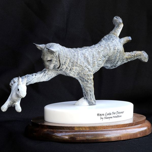 Shayne had a faithful border collie for 13 years. Polly LOVED to watch nature programs TV and her favorite was an old Marty Stauffer VHS called "Great Escapes". She would lunge at the TV when she saw the Canada lynx chasing the snowshoe hare. When Polly died in 2018, Shayne started this bronze sculpture. Maybe someday he'll do one of Polly, but this one makes us smile at the memory.